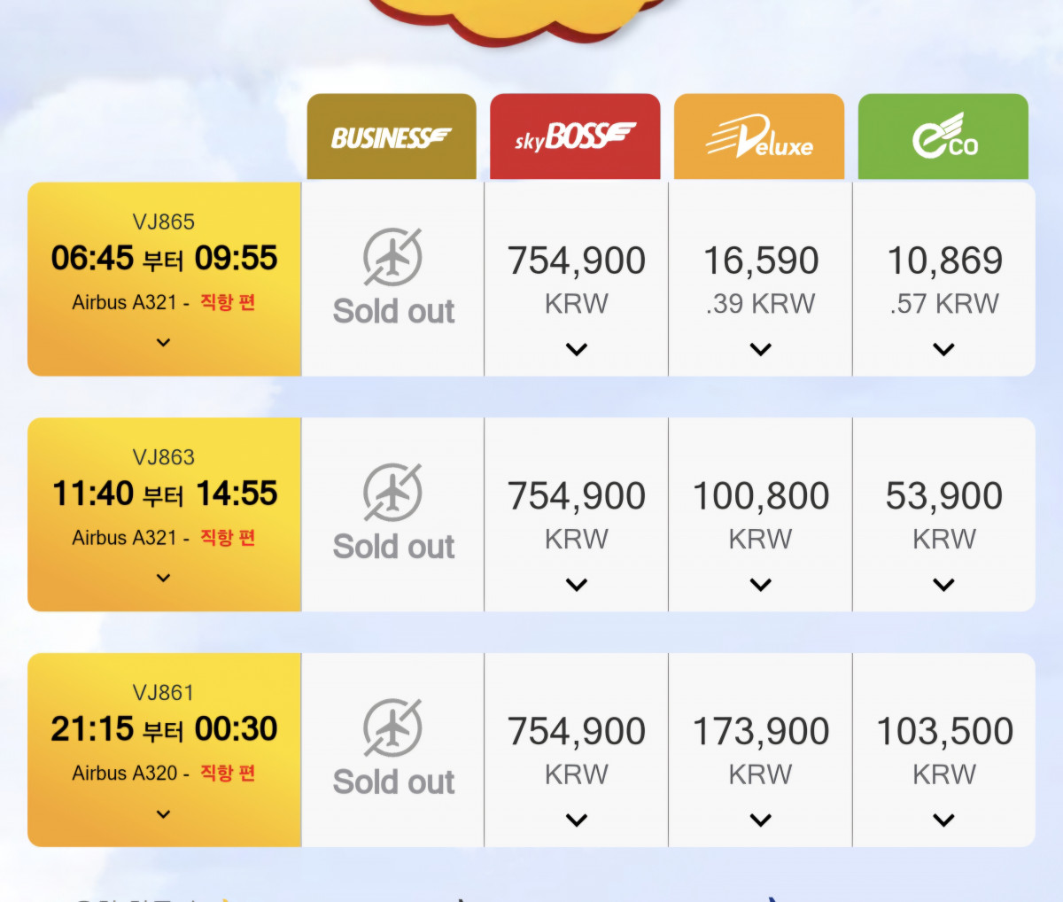 비엣젯항공 매진시 그 시간이안뜨나요?