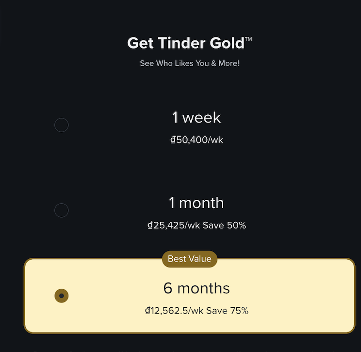 어제 베트남 물가로 6개월 틴더 골드 결제하니 총 $12.50 정도가 나오더라고요...