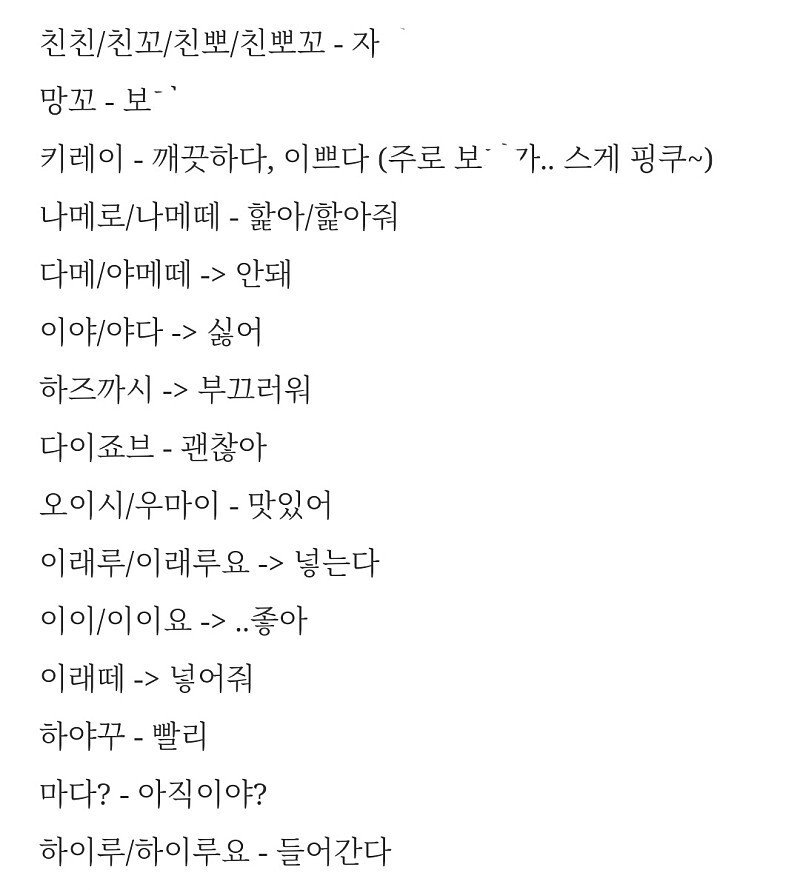 저는 과거에 일본어로 대화를 할 수 있었는데 (지금은 거의 다 잊어버렸습니다) 위 단어는 거의 모르겠습니다.ㅋㅋ