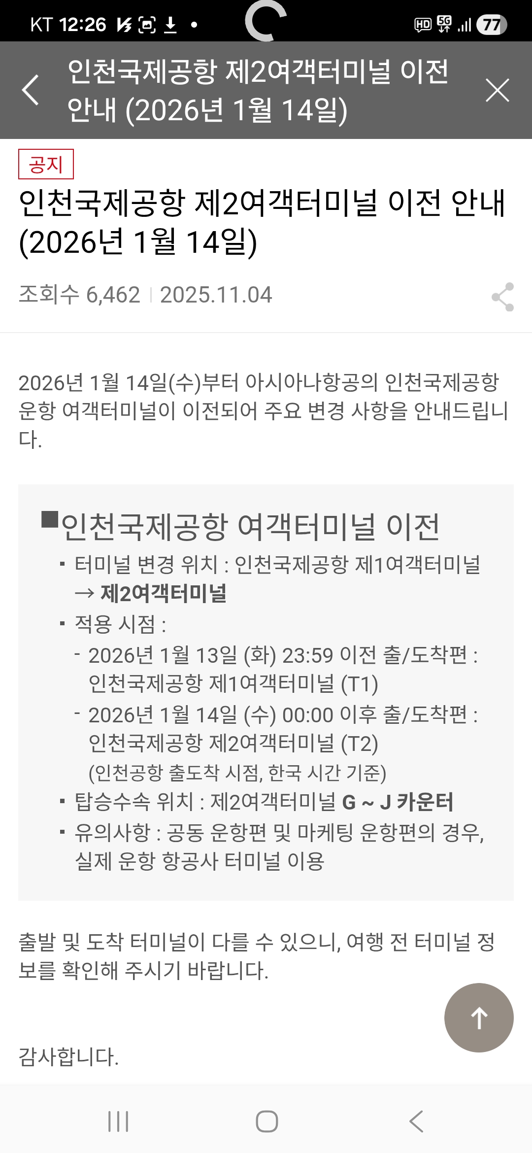 아시아나항공 터미널 이전(T2)