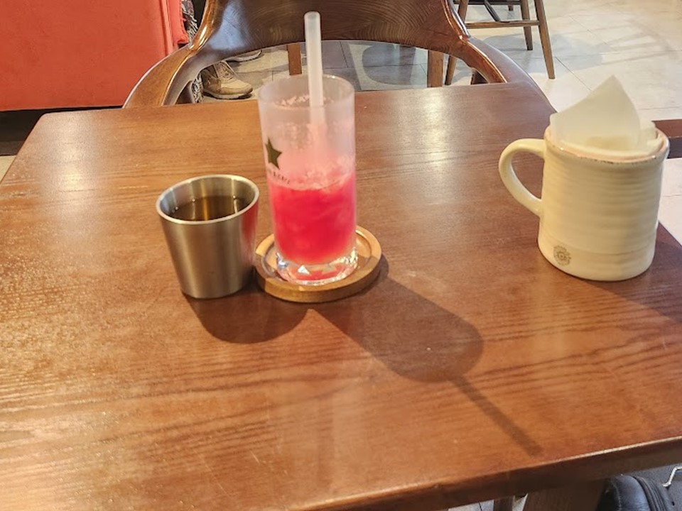 안남카페의 아아를 사서 테이블에 앉았는데 멀리 보이는 수박쥬스는 안남카페의 것이 아니고, 노스타워상가에 있는 다른 곳에서 산 것으로 3만동이었습니다.