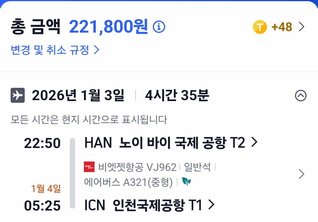 얼마전에 1월 3일. 하노이에서 인천으로 오는 편도 비행기표를 예매했습니다.
