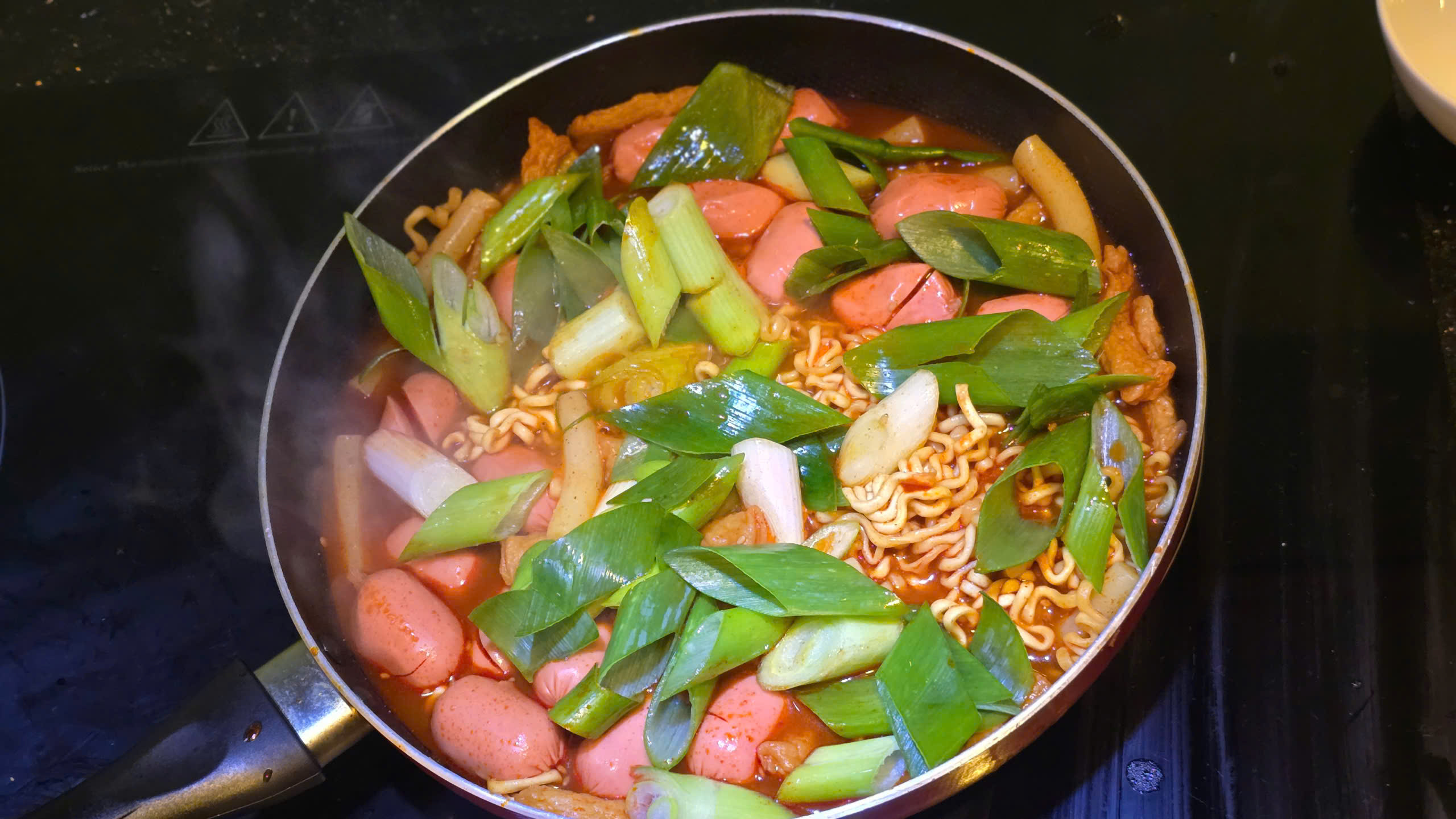 일단 불닭과 떡볶이 소스 물(550ml)에 풀고, 물이 끓으면 소세지, 떡 투입하고 1분후에 면 투입, 마지막으로 오뎅 넣고, 대파 썰은거 넣으면 끝입니다.( 처음에 떡볶이 소스는 반만 넣고, 간을 보면서 조금씩 추가하세요)