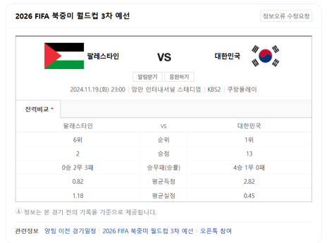 아~ 그리고 내일 11/19일 대한민국 VS 팔레스타인 3차 예선 입니다.