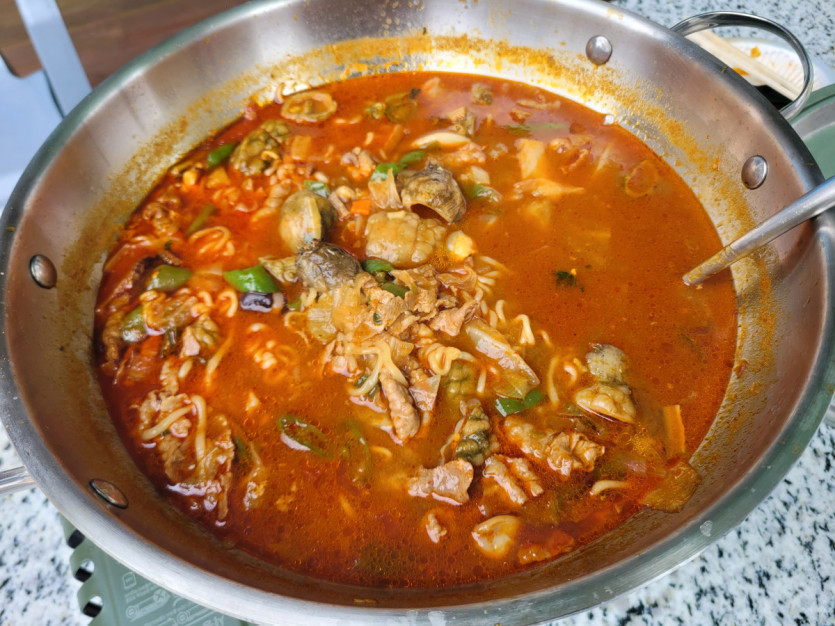 도착후 바로 아침을 먹을 수 있도록 차돌박이 쭈꾸미탕과 얼큰한 라면을 세팅해봅니다.