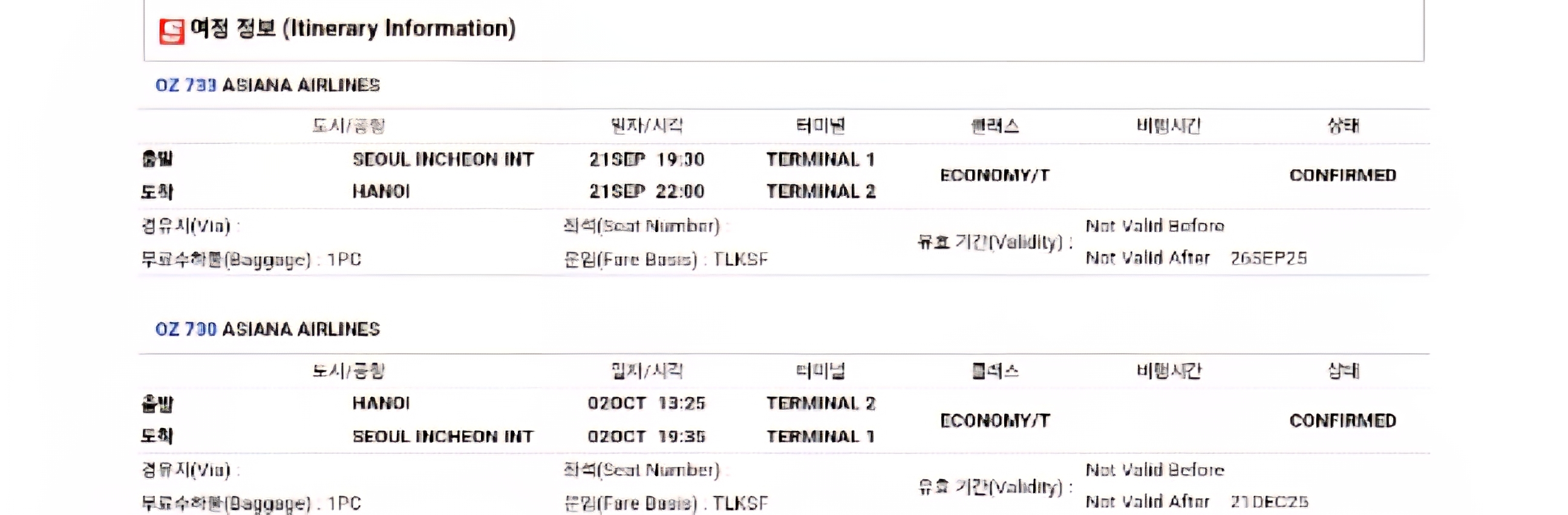 그래서 하노이로 12일동안 가는 것으로 고민하다가 바로 티켓 검색을 하니 아시아나가 싸게 나와있어서 9월 21일부터 10월 2일 일정으로 하노이 왕복 티켓을 발권했네요.
