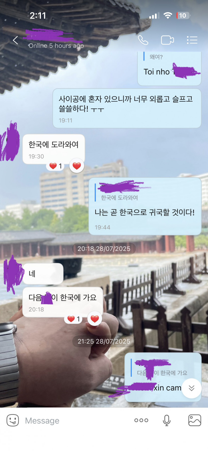 제가 방콕시절부터 최근까지 하노이사마한테 많이 외롭다고 여러번 징징거렸고 하노이사마는 올해 한국방문계획이 없다고 하였으나 제가 방콕에서부터 하노이사마에게 5월부터 최근까지 몇달에 걸쳐 지속적으로 한국방문요청하며 여러번 설득하니까 결국 설득이 통한건지는 몰라도 하노이사마가 이번달 하순 삼성전자 퇴사하면 외로운 저를 위해 다음달정도에 한국입국한다고 며칠전 사진의 대화에서 약속하였습니다.