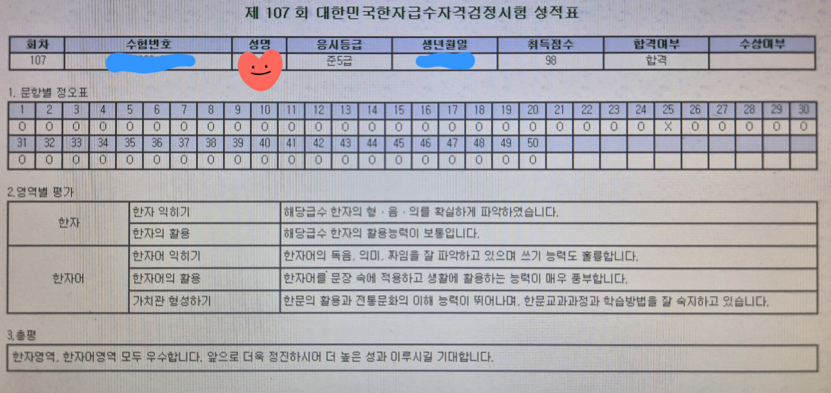 한문 시험 합격해 기분 좋으나 무언가 아들에게 빨린 느낌이..