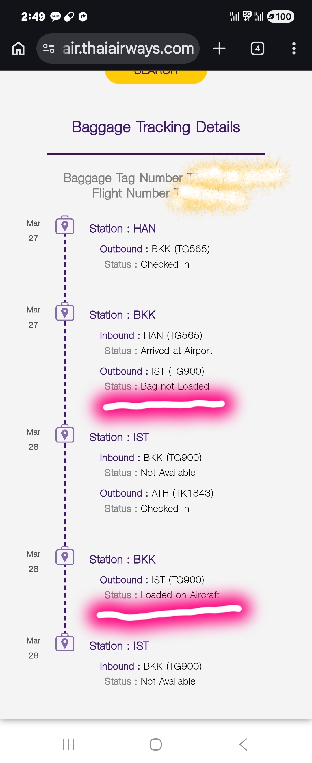 타이항공 수화물 조회 사이트에서 조회해 보니