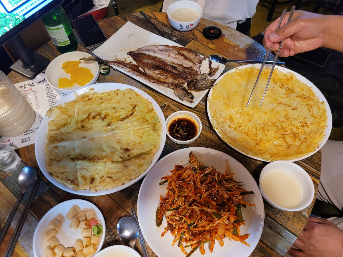 2차에서 4명 각자 먹고 싶은것들 하나씩 시키고 막걸리를 들이키다보니 분위기가 좋네요. 밖에는 비가 부슬부슬 내리고.