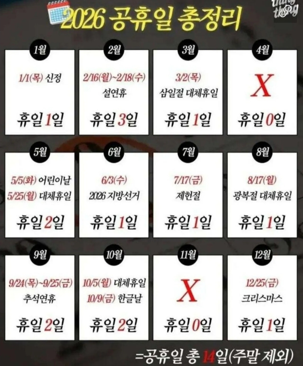 26년 공휴일 정리입니다 (주말빼고 쉬는날)