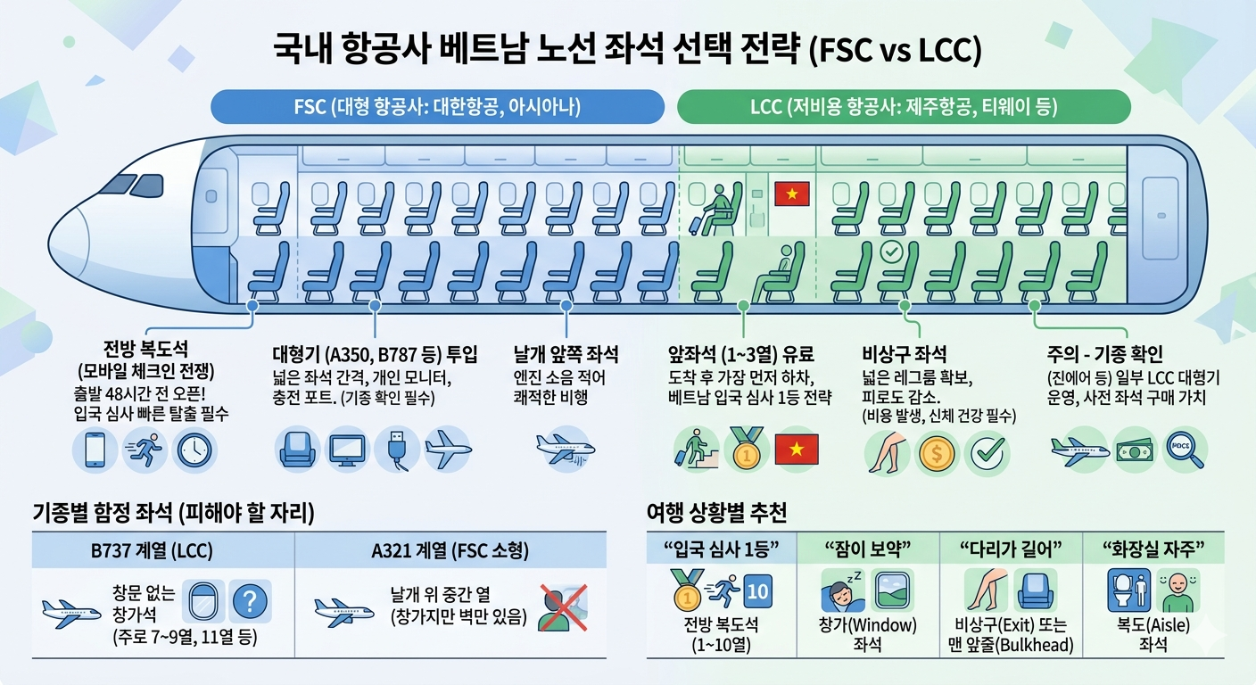 대한항공/아시아나를 이용한다면 대형기 투입 여부와 48시간 전 모바일 체크인이 핵심이고, LCC를 이용한다면 앞좌석/비상구 유료 구매가 즐거운 여행의 시작이 될 것입니다.