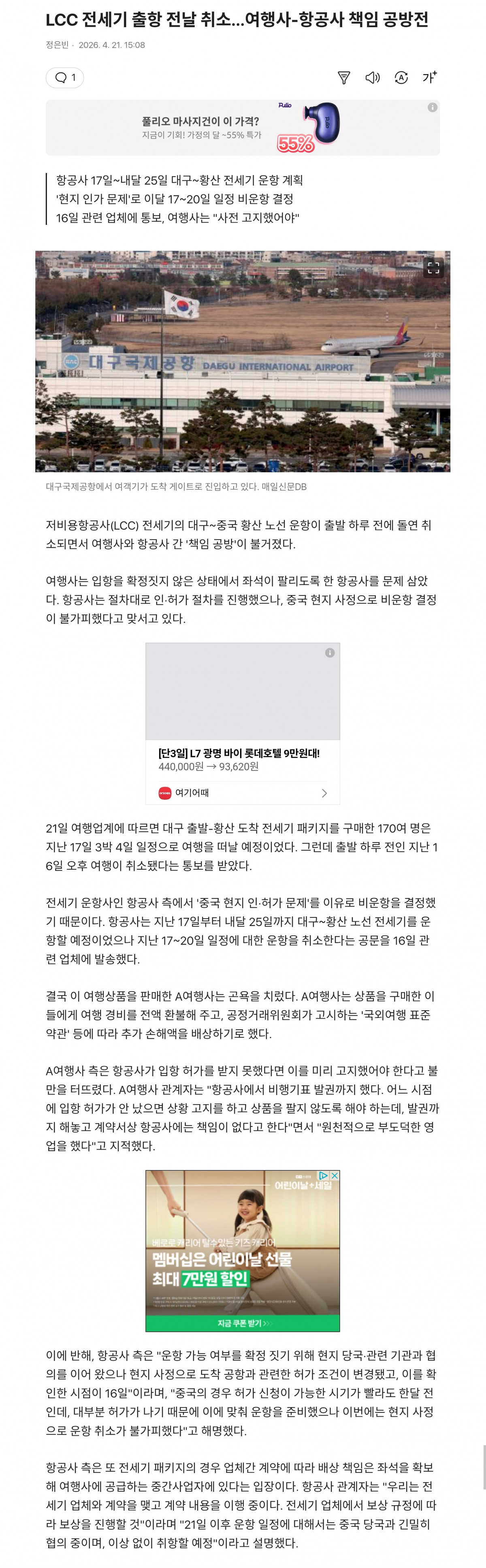 LCC 전세기 출항 전날 취소…여행사-항공사 책임 공방전 https://share.google/vPRgOqcaubK3XNmod