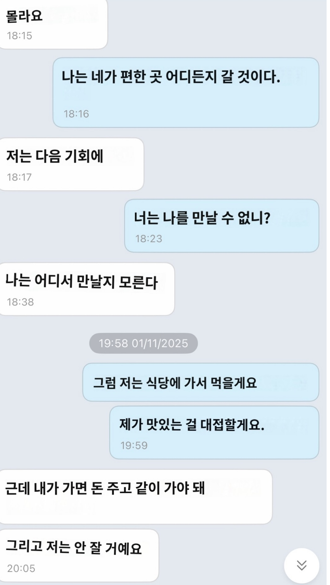 베트남에 와서 톡 보내니까 이런식 ㅎㅎ 같이 밥만 먹을거고 돈을 줘야한다 맨날 이럽니다 ㅋㅋㅋㅋ