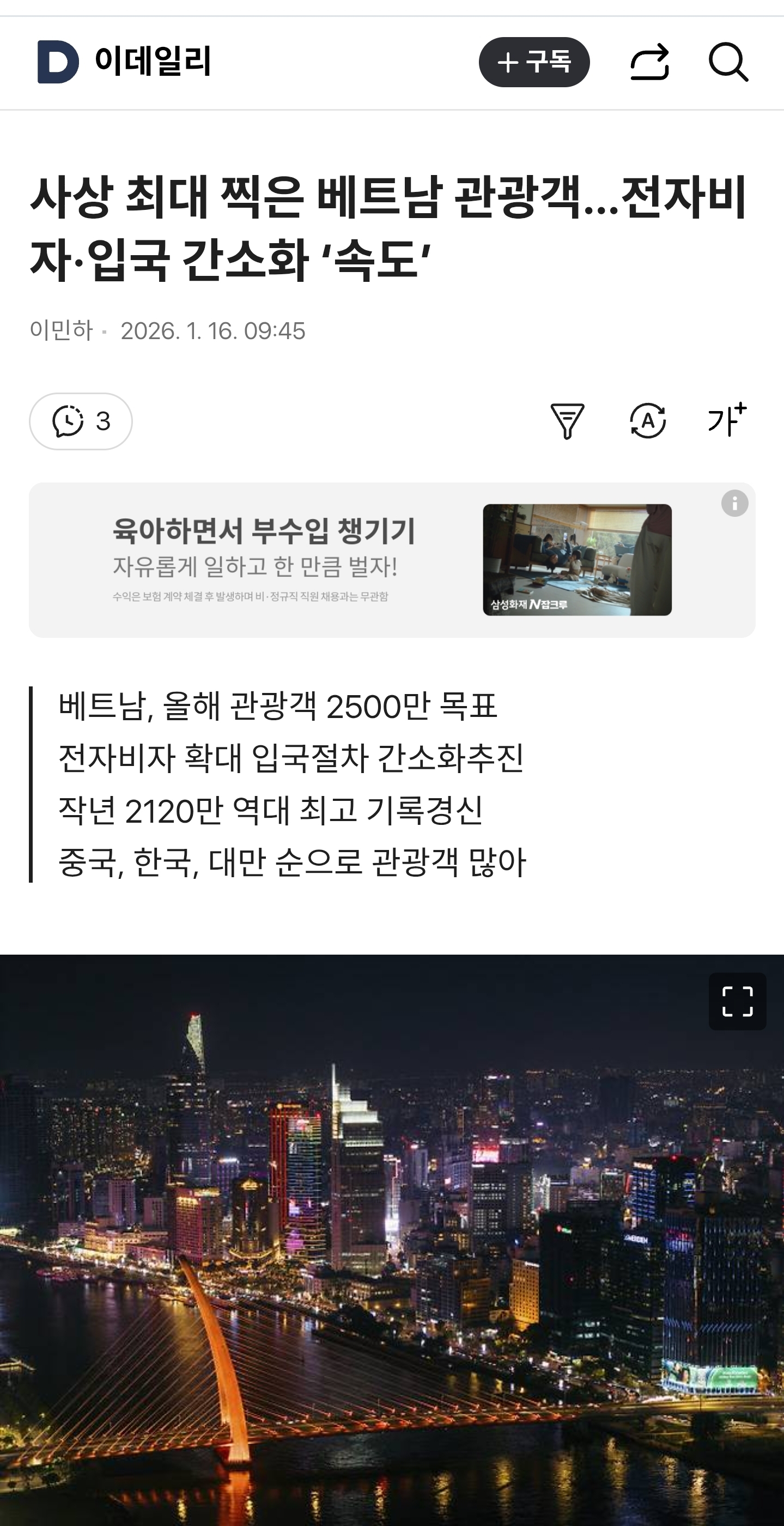 해당 Daum 기사(2026년 1월 16일자)에서 보도한 '베트남 관광객 사상 최대 기록 및 전자비자·입국 간소화' 내용은 베트남 현지 주요 뉴스 및 정부 공식 발표 자료와 대조한 결과, **대부분 사실(Fact)**로 확인되었습니다.