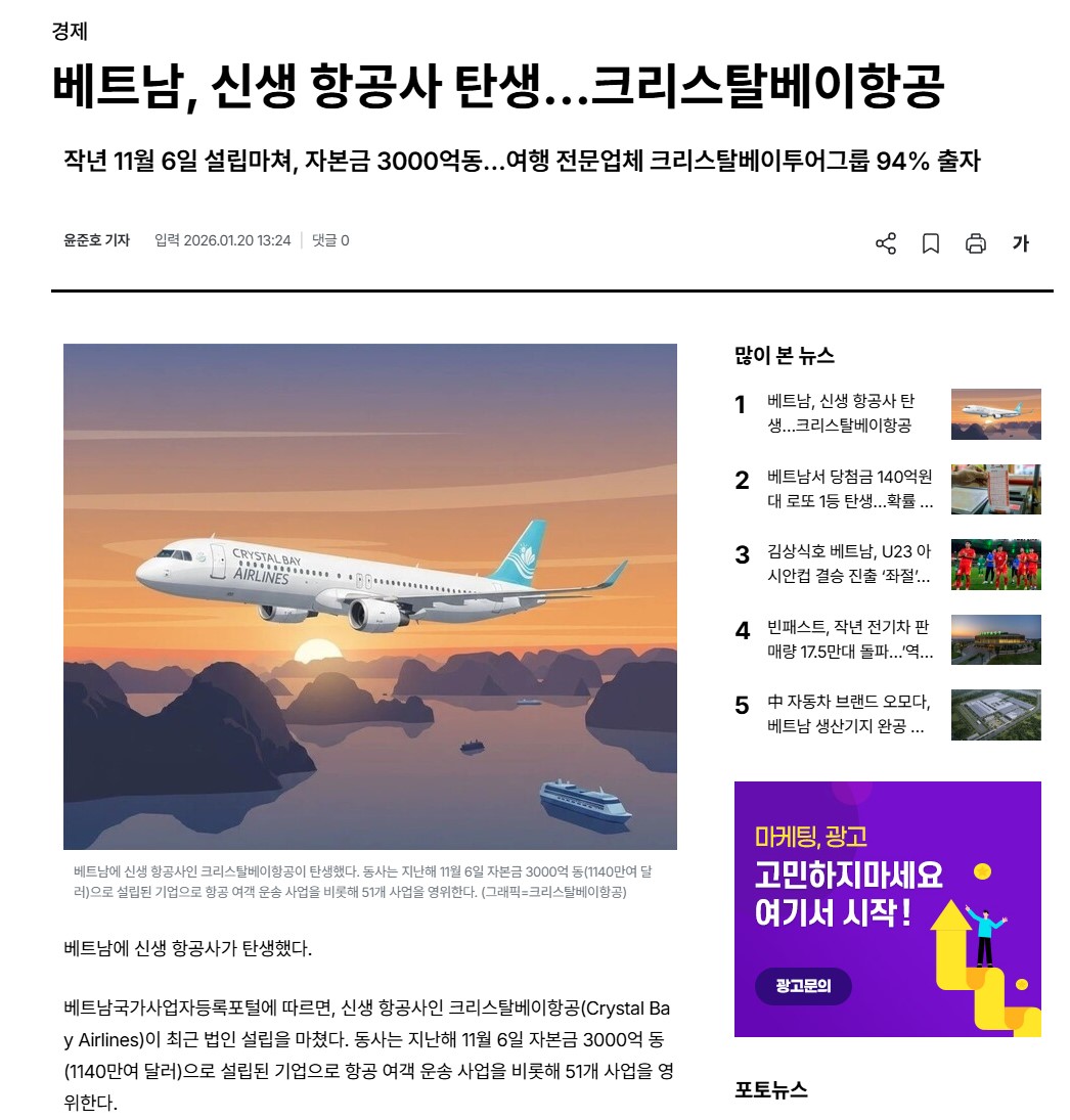 뉴스에 베트남 신생 항공사 탄생이라고 뜨길래