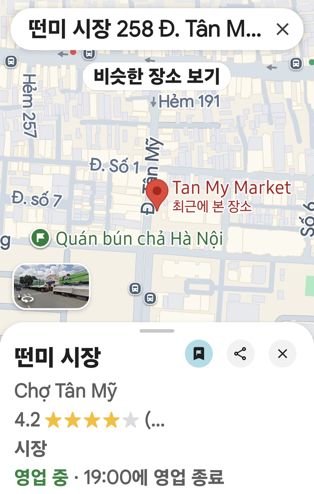 사진속 오른쪽이 떤미시장 정문이고 횡단보도 반대편 보이는