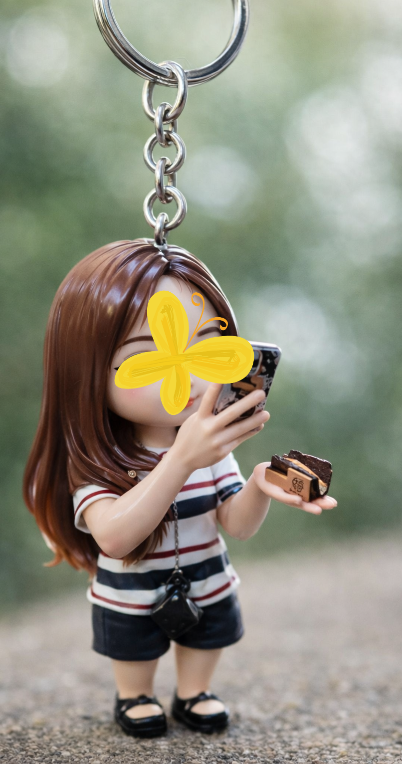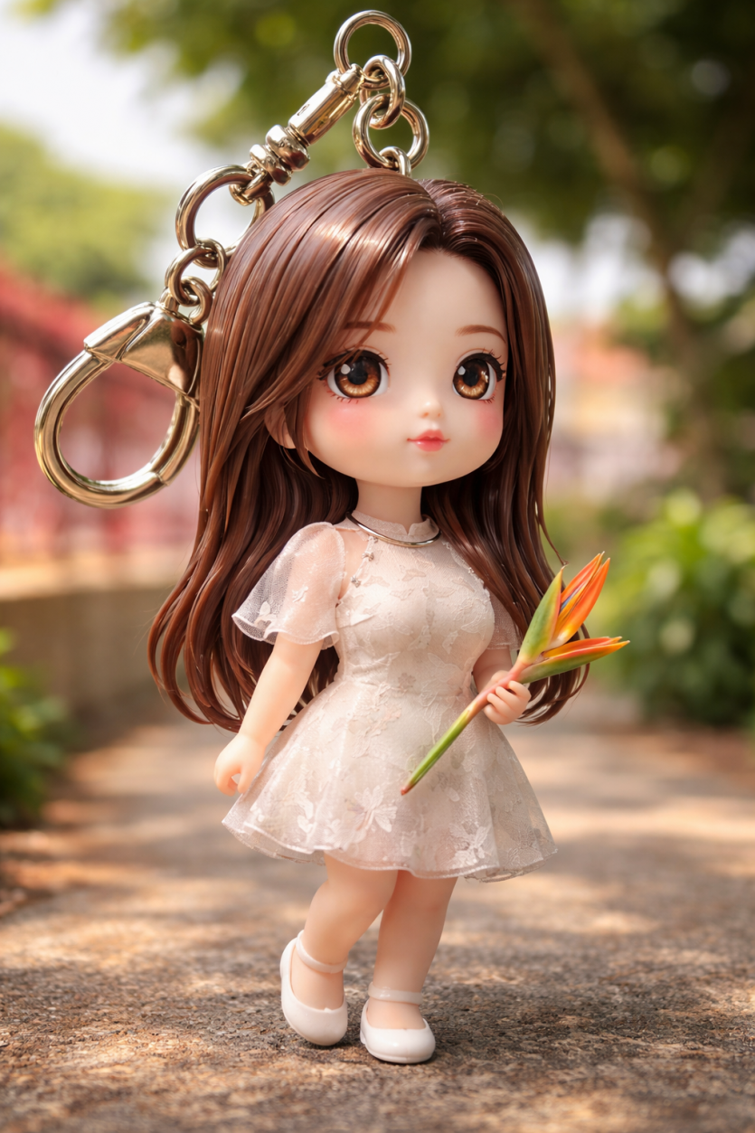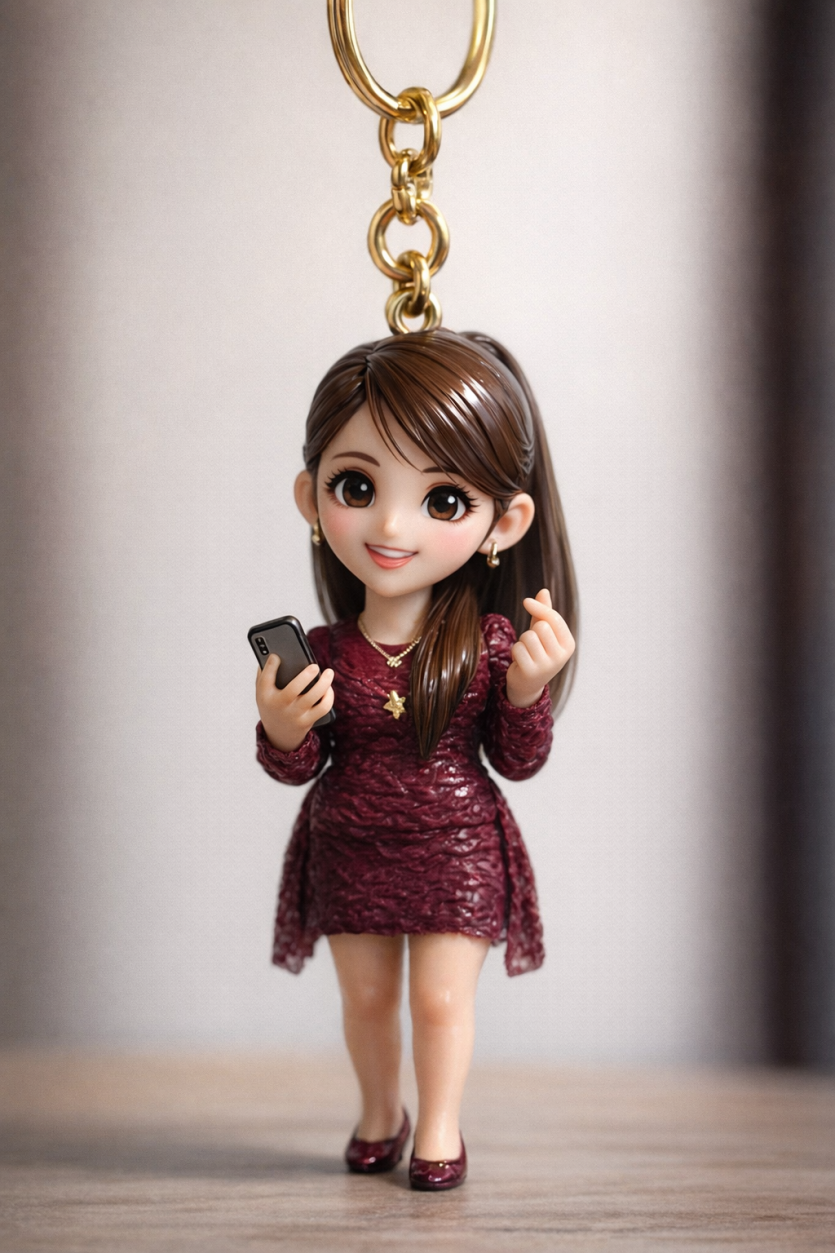 인물이나 대상을 작은 3D 피규어 키링으로 바꿔줘. 인물이 있다면 닮은 모습은 유지하되, 둥글고 장난감 같은 비율의 작은 수집용 피규어로 표현해줘. 인물이 아니라면 사물이나 동물을 실제 크기와 재질감을 살린 키링 피규어로 만들어줘. 표면은 유광 레진 마감으로 하고, 은은한 페인팅 디테일을 더해줘. 위쪽에는 금속 고리를 달아서 키링과 연결된 모습이 보이게 해줘. 조명은 부드러운 자연광을 사용하고, 얕은 심도로 촬영한 것처럼 표현해서 전체가 실제 사진처럼 자연스럽고 사실적으로 보이게 해줘.